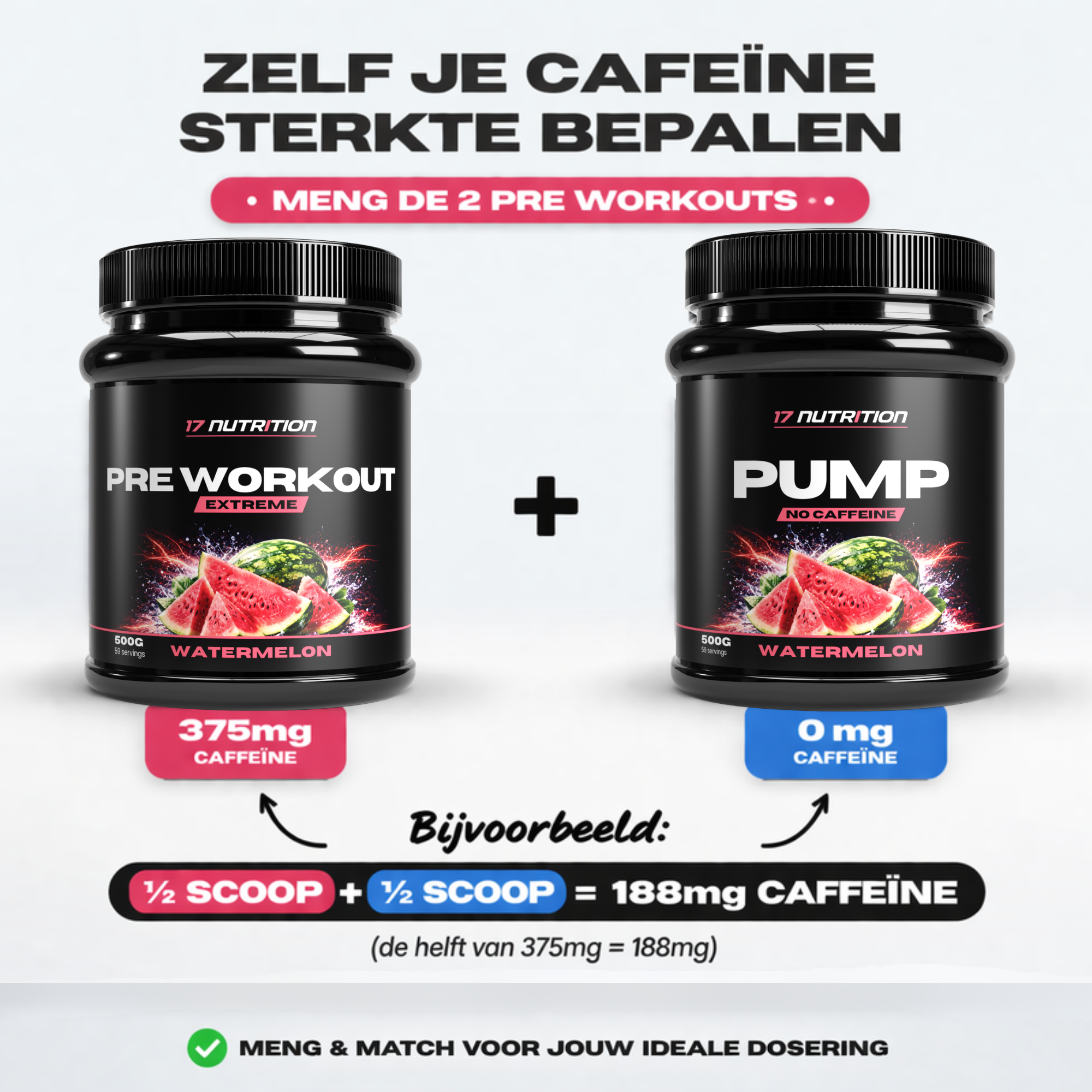 Pre Workout Extreme en PUMP zijn identiek samengesteld, met één belangrijk verschil: PUMP is cafeïnevrij en Pre Workout Extreme bevat 375 mg cafeïne per scoop. Door deze twee te combineren, bepaal je eenvoudig zelf hoeveel cafeïne het beste bij jouw training past.